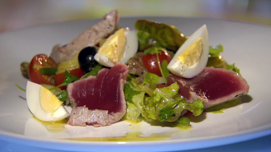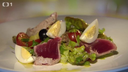 Opečeného tuňáka nakrájíme na plátky a položíme na salát společně s vejcem.