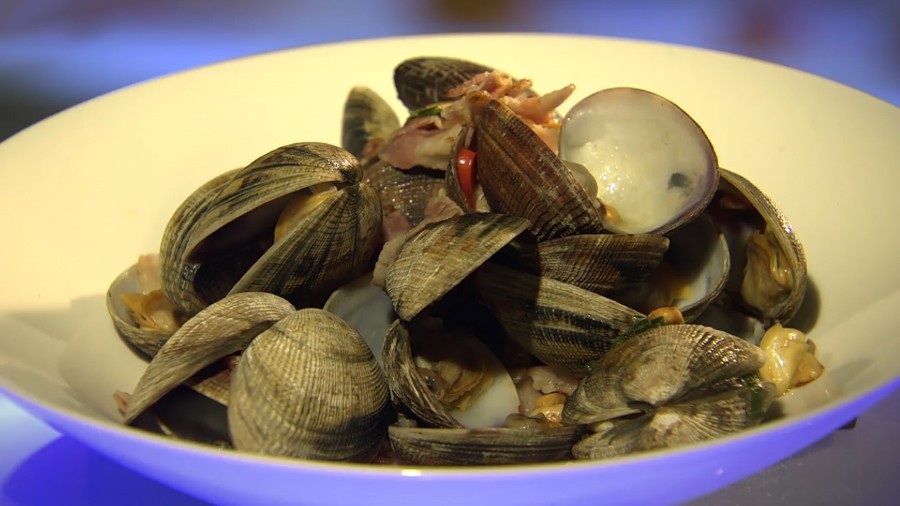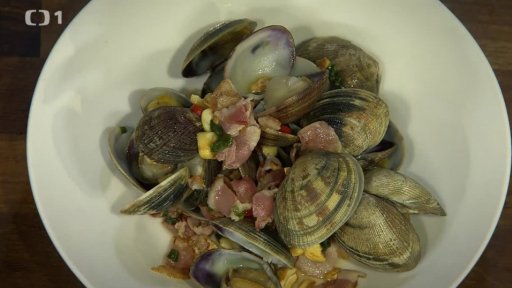 Nejdříve orestujte na nudličky nakrájenou slaninu. Přidejte nakrájenou chilli papričku, jarní cibulku a srdcovky. Zalijte vývarem, zaklopte a vařte 3 až 4 minuty. Na další pánvi si orestujte kešu oříšky. Zkontrolujte, zda se mušle všechny otevřely, dochuťte limetovou šťávou, pepřem a přidejte oříšky.