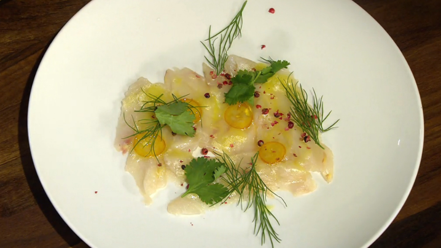 Plátky jesetera naskládejte na talíř, osolte a potřete citrónovým olejem, obložte je kumquaty, posypejte pepřem a bylinkami.