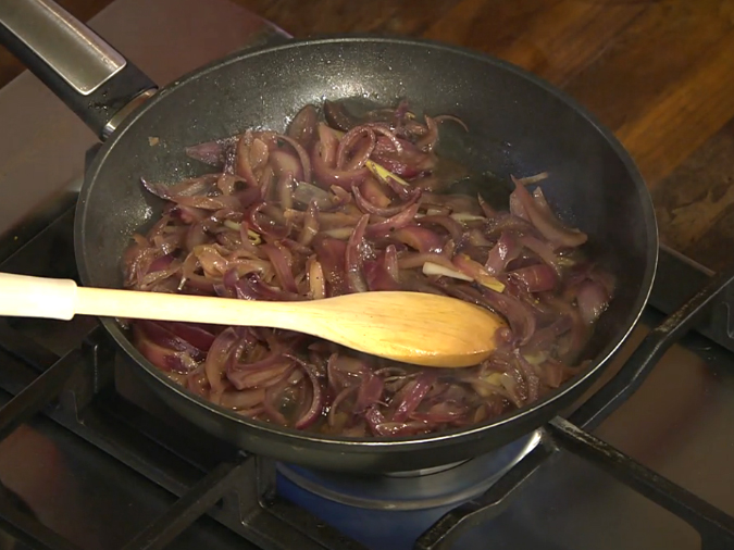 Cibuli restujeme na oleji, opakovaně k ní přiléváme vývar a vždy jej necháme zredukovat. Pak přidáme hrubozrnnou hořčici, červený vinný ocet, osolíme, opepříme, chvíli povaříme a dokončíme nasekanou petrželí.