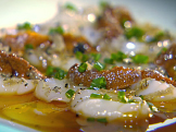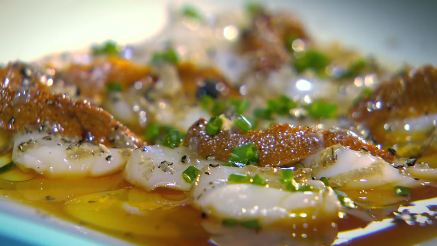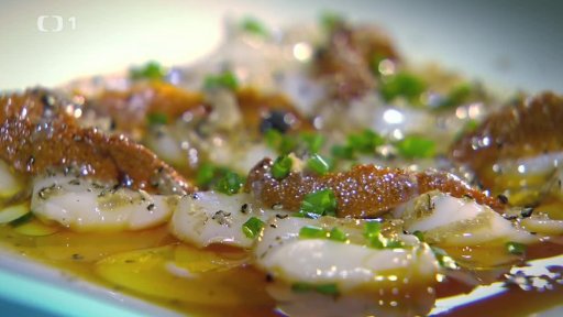 Mušle sv. Jakuba nakrájíme na plátky, z ježovek vyjmeme maso a vše dáme na talíř. Maso pokapeme omáčkou ponzu a posypeme nasekanou pažitkou. V kastrůlku ohřejeme lanýžový olej. Na mušle nastrouháme lanýže a přelijeme je horkým olejem.