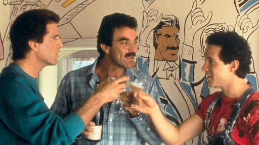 Francouzská komedie Tři muži a nemluvně (1985) se stala v zemi svého vzniku velkým hitem a s úspěchem se hrála i v dalších státech (mj. i v tehdejším Československu). Samozřejmě Hollywood si podobného ohlasu nemohl nevšimnout. Čerpání námětů z francouzského prostředí ostatně není ničím výjimečným (viz filmy jako Bratranec, sestřenice, Mzda strachu, Devět měsíců, Klec bláznů nebo U konce s dechem). Společnost Walta Disneyho se v osmdesátých letech snažila komerčně posílit svou tvorbu a vytvoření vlastní verze Tří mužů a nemluvněte vypadalo jako dobrý nápad (a také splnilo zamýšlený účel). Kromě přenesení děje z Paříže do New Yorku ani nebylo zapotřebí nic zásadního měnit. Trojice poněkud nezodpovědných mužů, sdílejících společný byt na Manhattanu, se musí postarat o malé dítě jednoho z nich a jejich snažení je kromě běžných starostí komplikováno malou kriminální zápletkou. Do hlavních úloh studio obsadilo populární herce z televize Toma Sellecka, Teda Dansona a pak Stevea Guttenberga, který jako jediný z této trojice měl za sebou větší filmové úspěchy (např. Policejní akademie, Číslo 5 žije nebo Zámotek). Důležitější z diváckého hlediska však patrně byly obě roztomilé představitelky malé Mary, které se při natáčení střídaly. Snímek, režírovaný známým hercem Leonardem Nimoyem (představitel Spocka v původním Star Treku), byl do amerických kin uveden v listopadu 1987 a ještě se stačil stát komerčně nejúspěšnějším filmem roku.