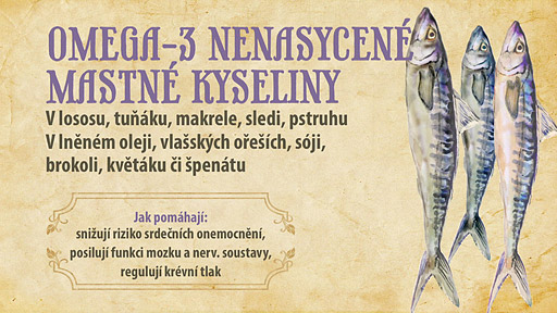 Omega-3 nenasycené mastné kyseliny jsou klíčovými prvky v celé řadě procesů v lidském těle. Nenasycené mastné kyseliny EPA a DHA pomáhají udržovat naše srdce zdravé. Omega-3 živočišného původu najdeme v rybách, jako je losos, tuňák, makrela, sleď, pstruh a v mořských plodech, omega-3 rostlinného původu pak v lněném oleji, vlašských ořeších, v oleji z řepky a soji. Abychom přijali dostatek omega-3 nenasysených mastných kyselin, musíme sníst zhruba půl kila ryb za týden.