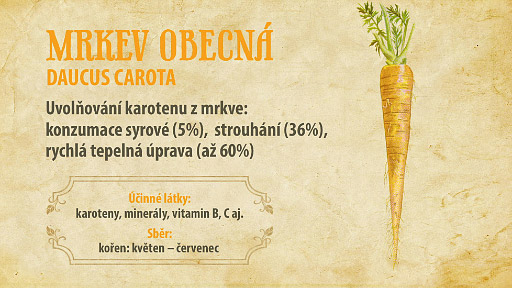 Mrkev pochází z Asie, z oblasti Afghánistánu a Pákistánu, odkud se postupně rozšířila do všech kontinentů. Je jedním z nejlepších zdrojů beta karotenu, ten se v těle mění na vitamín A, který působí blahodárně na kosti a zuby. Vysoký obsah vlákniny pak udělá dobře vašim střevům. Pektin obsažený v mrkvi na sebe umí vázat těžké kovy a příznivě ovlivňuje látkovou výměnu. U dětí předškolního věku pomáhá zlepšit paměť, u dospělých pak snížit hladinu cholesterolu. Pitím mrkvové šťávy posilujete imunitu a prospěje to i vaší pleti.