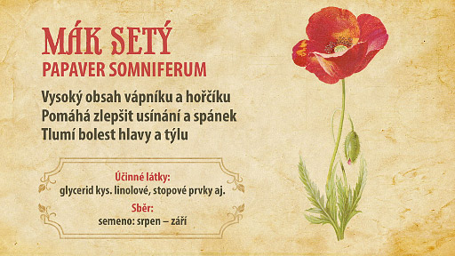 Léčebné i omamné účinky máku jsou známé od starověku. Naše praprabičky ho podávaly svým dětem, aby spaly a nezlobily. Ve farmacii se uplatňuje zejména na tišení bolesti. Ovšem pole zaplavená bílými, lehce fialovými květy by vás měla inspirovat jinak – mák je zásadotvorný, posiluje nervy a obsahuje 12krát více vápníku než mléko. Zralá semena a olej bychom měli zařadit do jídelníčku všichni, nejen nastávající maminky a děti. A opravdu platí – pokud nemůžete usnout, uvařte si před spaním odvar z mletého máku.