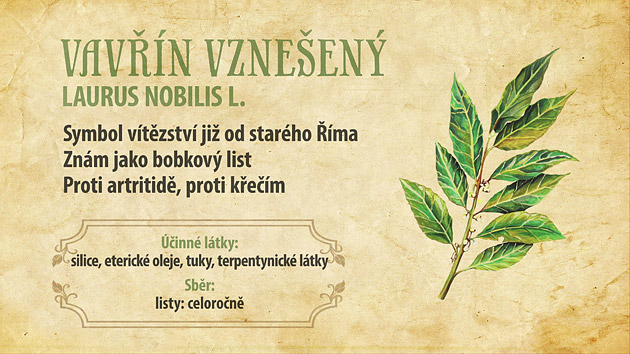Vavřín je vznešený. Vavřín se dá pěstovat i u nás. Vavřín je bobkový list, takzvaný bobek. Je skvělý proti artritidě a křečím. Ve vavřínový strom proměnila nymfa Dafné, aby se skryla před Apollónem, který pak na znamení smutku z neopětované lásky nosil na hlavě vavřínový věnec.