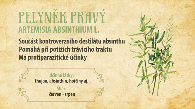 Rostlina tak hořká, že se stala synonymem hořkosti. Ve starověku byla zasvěcena bohyni lovu a měsíce Arthemis. Vyrábí se z ní nejkontroverznější alkoholický nápoj Absinth. Pelyněk podporuje tvorbu žluči, tudíž je skvělý při potížích trávicího traktu. Ale pozor, nesmí se užívat dlouhodobě a těhotné a kojící ženy vůbec.