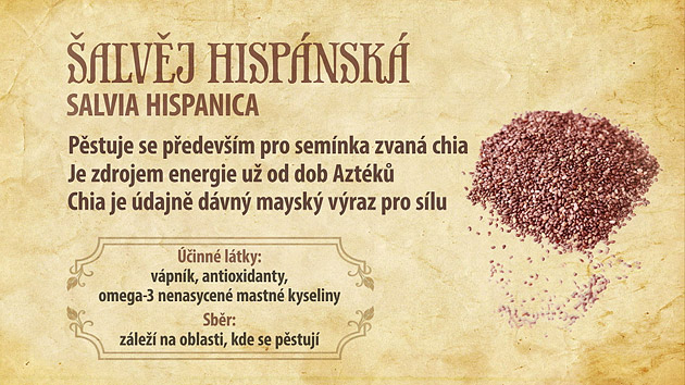 Chia semínka jsou plody šalvěje hispánské. Jsou označovány jako „jídlo aztéckých běžců a válečníků“ stačila jedna hrst semínek pro dodání energie na celý den. Chia patřila u starých Aztéků, Mayů a Inků mezi tři nejdůležitější potraviny společně s kukuřicí, fazolemi a amarantem. Konzumují se vcelku i mleté, s jogurtem, jako součást zeleninových salátů nebo se přidávají do pečiva. Když se zalijí vodou, vytvoří výživný rosol, který může sloužit jako náhražka oleje a vajec. Semínka nemají žádnou chuť. Jsou vhodná i pro celiaky a diabetiky.