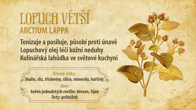 Lidově babihněv, čumbrk, makrabule, nouze neboli žebrácké vši. Lopuch má celou řadu léčivých účinků. Kromě inulinu kořen obsahuje sliz, třísloviny, silice, minerály a hořčiny. Jeho zásadní přínos je v podpoře látkové výměny a léčení chorob kůže. Dále působí močopudně, mírně projímavě a žlučopudně.