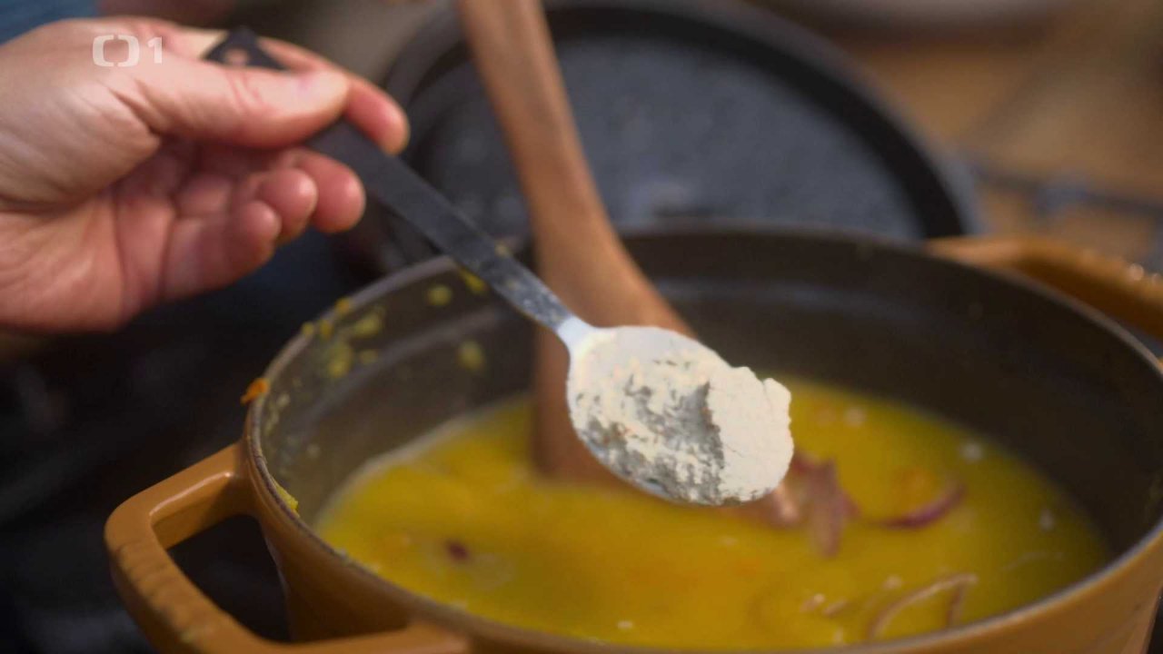 Dýni pokrájejte na kusy a upečte v troubě do měkka. Na másle zpěňte cibuli a vhoďte do ní dýni. Zarestujte, zalijte vodou nebo vývarem a nechte rozvařit. Osolte, opepřete a polévku zjemněte smetanou, může být i rostlinná.