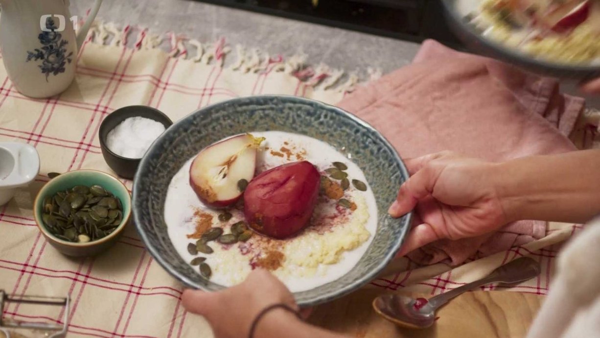 Kořeněná jáhlová kaše s pošírovanou hruškou