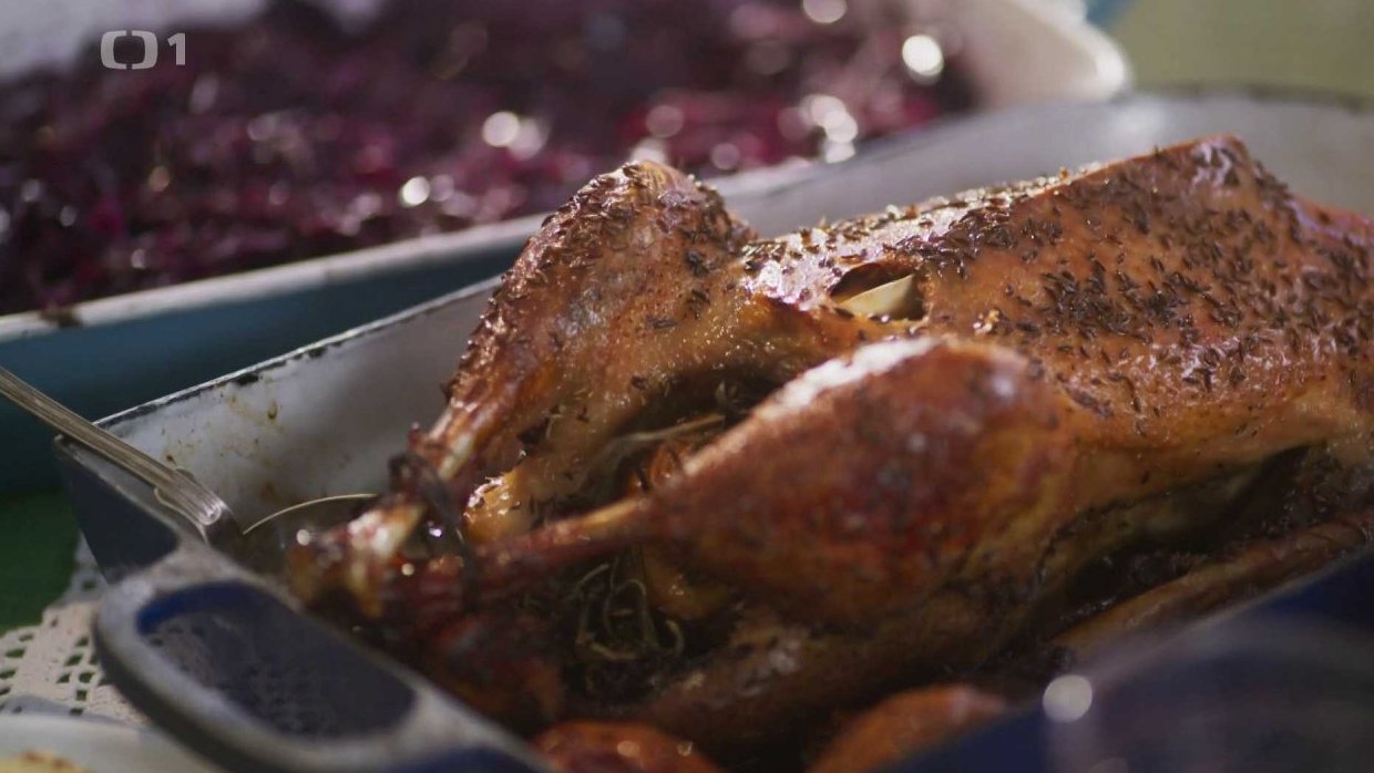 Zbylé kdoule a jablka zbavte jádřince, nakrájejte na čtvrtky a přidejte je přibližně po 1½ hodině pečení do pekáče. Pečte ještě zhruba 1 hodinu, až bude husa měkká, stehýnka se volně protočí v kloubu a z prsíček bude vytékat světle žlutá šťáva.