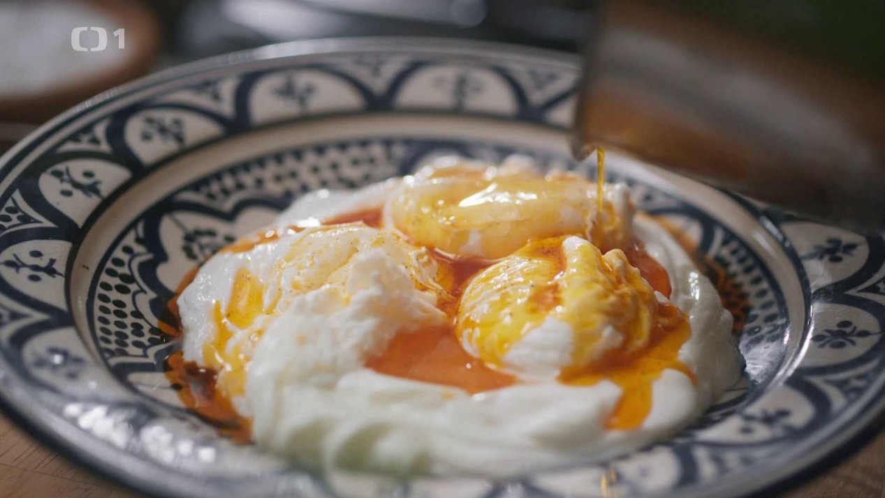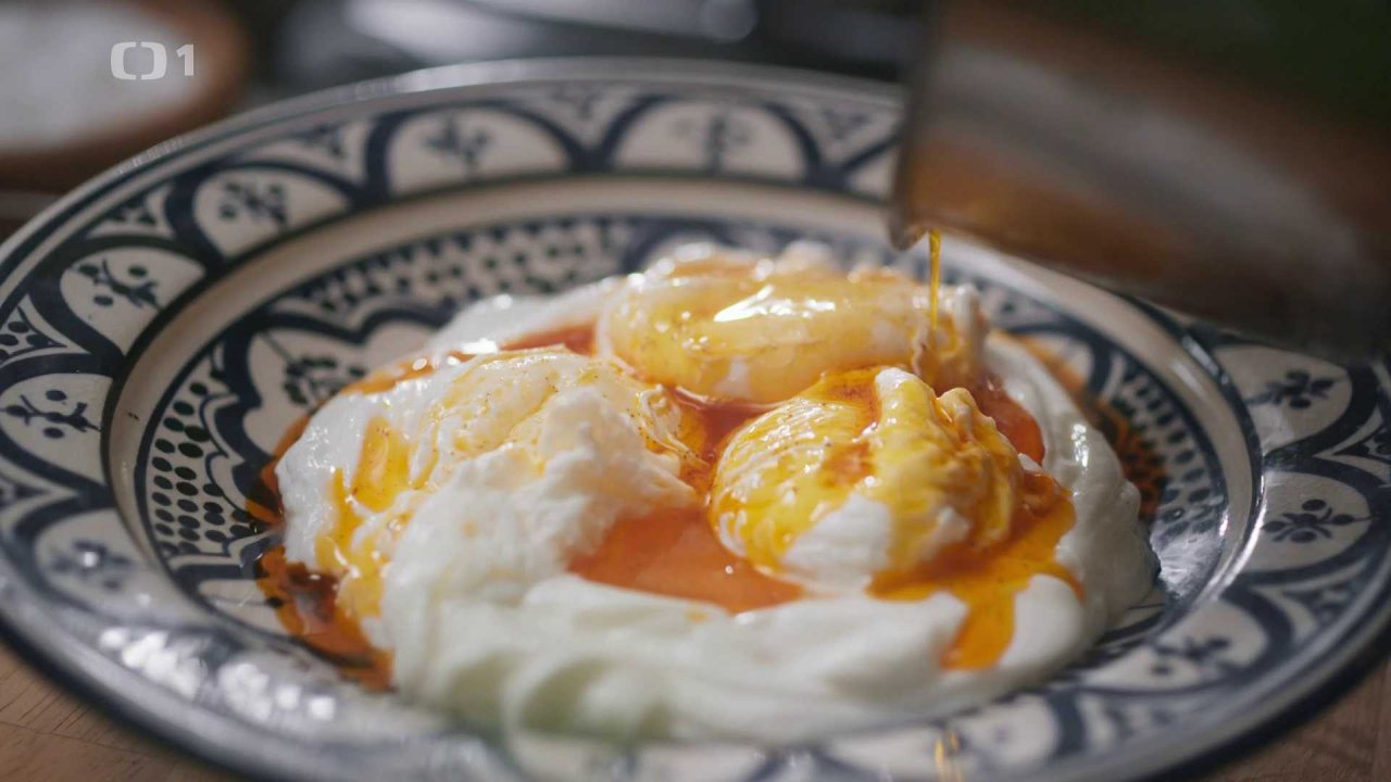 Jogurt osolím a zamíchám s oloupaným a nastrouhaným česnekem. Dochucený jogurt vložím do hlubokého talíře. V rendlíku přivedu k varu osolenou vodu a přídám od lžíci octa. Zmírním var a vodu zamíchám lžící tak aby se vytvořil vír, do kterého opatrně vyklepnu vejce. Nechám ho krátce povařit (cca tři až čtyři minuty) a hotové vejce vyjmu a nechám okapat. Připravím tak všechna tři vejce a položím na dochucený jogurt. Rozpustím máslo a nechám na něm zpěnit uzenou mletou papriku. Paprikovým máslem přeliji vejce s jogurtem a ozdobím bylinkami a chilli vločkami.