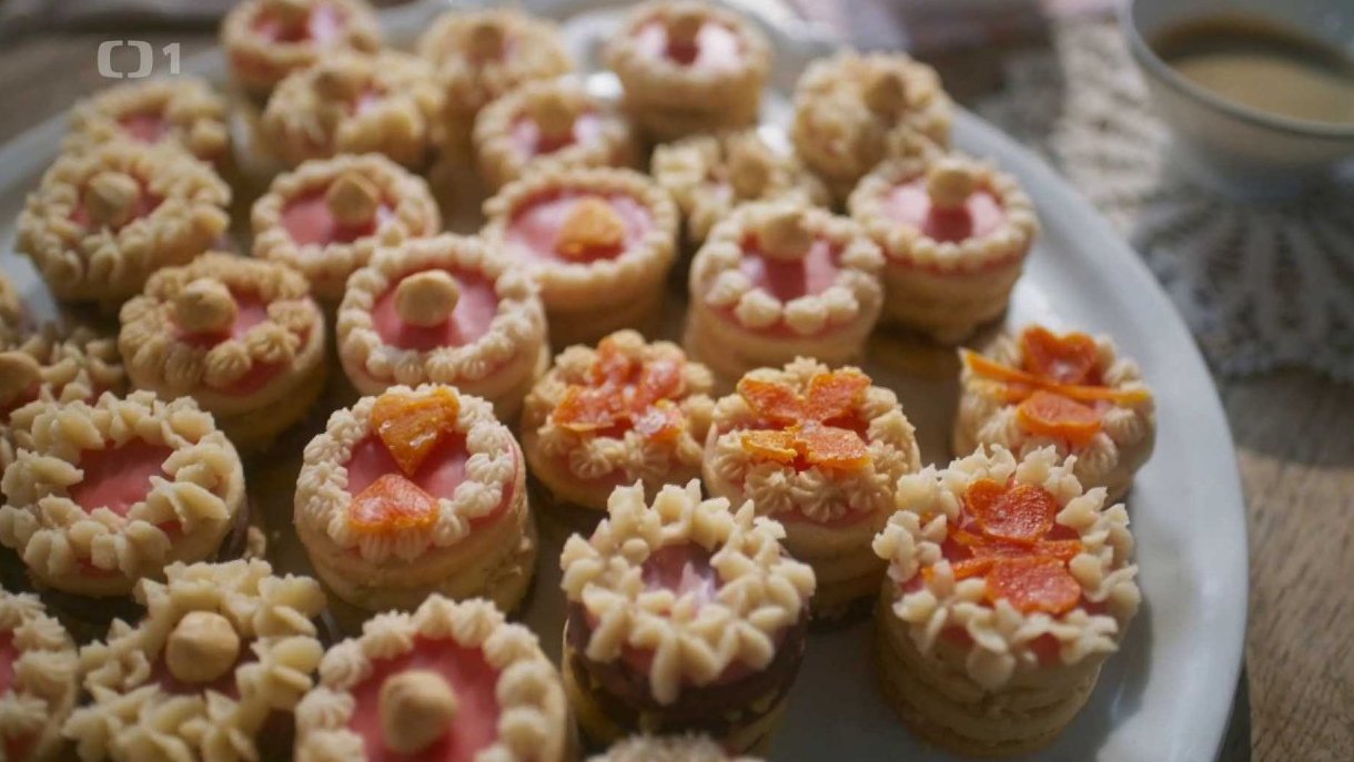 Troubu předehřejte na 160 °C. Lískové ořechy opražíme a sloupneme za tepla v utěrce slupku. Oříšky umelte. Dejte stranou. Do prosáté mouky rozkrájíme máslo a prohněteme. Přisypeme cukr, oříšky a badyán a se zbylými surovinami vypracujeme pružné těsto. Vyválíme ho na pomoučeném vále na plát silný 5 mm a vykrajujeme malá kolečka. Skládáme je na plech vyložený pečicím papírem a pečeme dozlatova, zhruba 5 minut. Vyjmeme a necháme vychladnout. V misce rozmíchejte kávu s cukrem dohladka. Mandle vyšlehejte s máslem a cukrem. Vmíchejte skořici, pomerančovou šťávu a punč. Polovinu koleček potřete krémem, nebo použijte plnící sáček a slepte je s prázdnými kolečky. Můžete vytvořit i dvě patra náplně. Přelijte polevou nebo ji jen použijte k přilepení datlí na vrch dortíčků. Ty vykrájejte nožem nebo tvořítky.