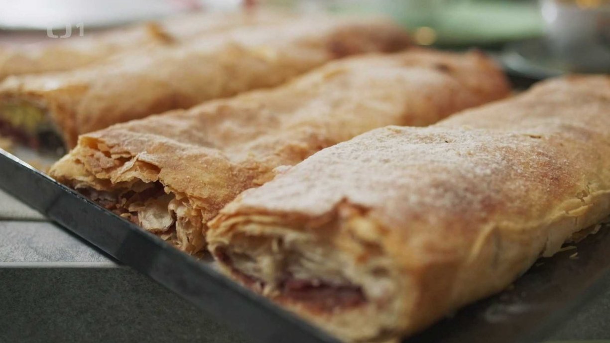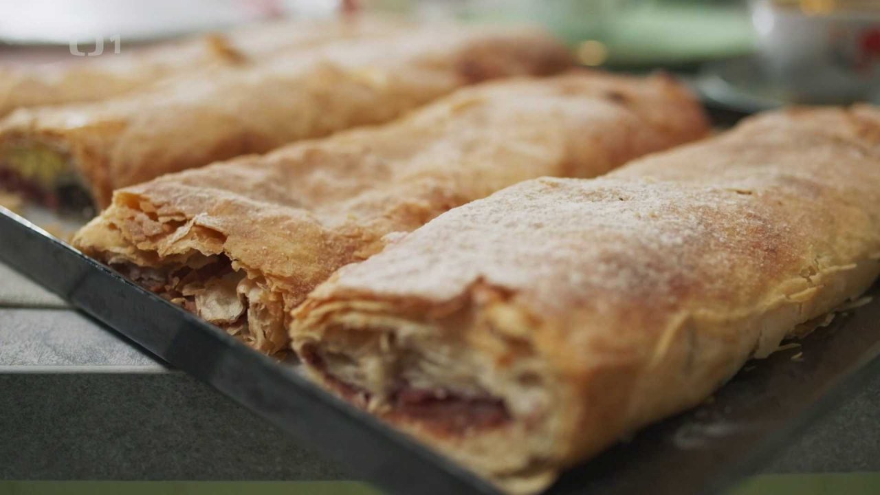 V míse smíchám horkou vodu s vinným octem a špetkou soli. Vodu nechám lehce zchladnout, ale musí zůstat stále velice teplá. Vmíchám nahřátou (tedy ne studenou) mouku, a vypracovávám těsto, dokud není středně tuhé a důkladně propracované. Těsto potřu teplým olejem a zabalím do potravinové fólie. Nechám těsto asi nejméně hodinu odpočinout. Mezitím si nachystám náplně. Jablka nakrouhám na mandolíně na tenké plátky, zbylé náplně prostě zamíchám.