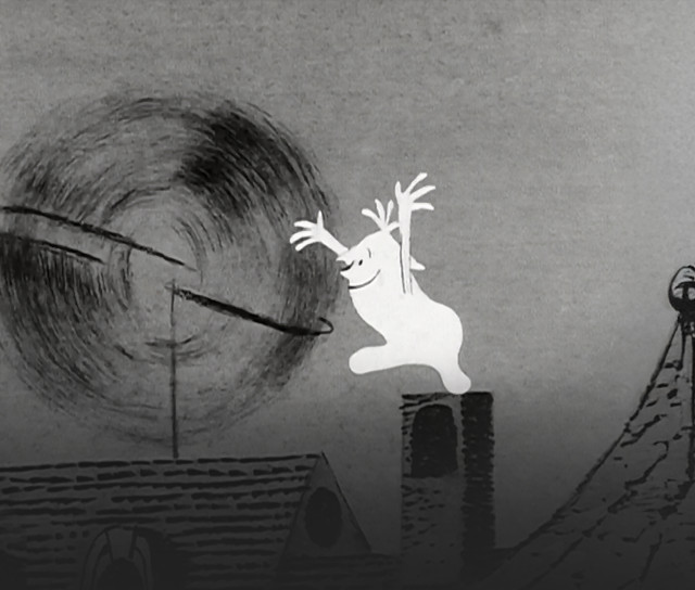 Příběh strašidýlka, které zlobí a točí se okolo televizní antény, čímž na obrazovce dělá šumy. Kluk, který televizi sleduje, se jde podívat, kdo to televizi ruší, a objeví malé strašidýlko. Následuje honička po střechách i konečné usmíření u televizní obrazovky.
