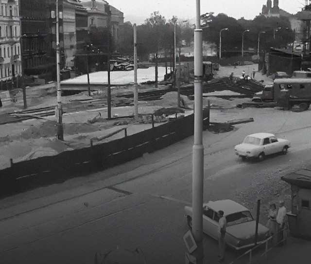 Redaktorka Ljuba Mesteková hovoří na staveništi budoucí stanice metra Muzeum s pracovníky Metrostavu.