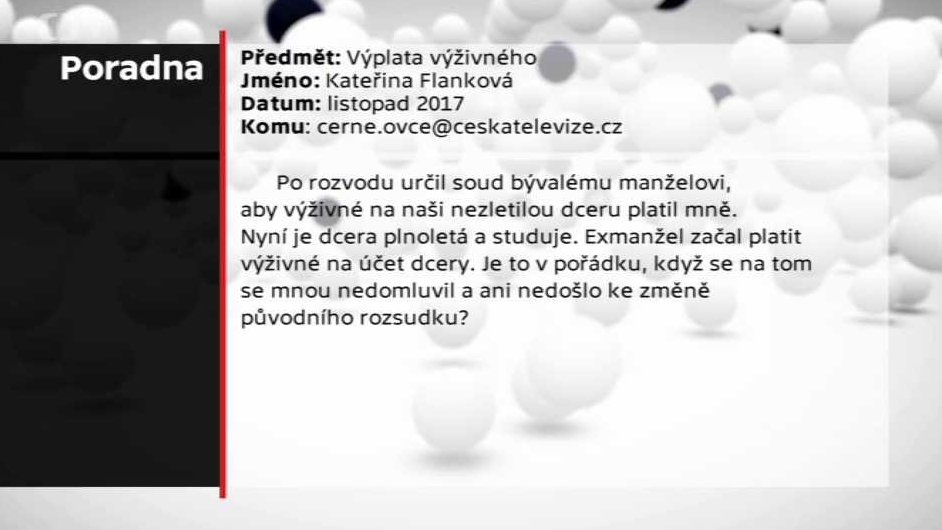 Dotaz diváka: Po rozvodu určil soud bývalému manželovi, aby výživné na naši nezletilou dceru platil mně. Nyní je dcera plnoletá a studuje. Exmanžel začal platit výživné na účet dcery. Je to v pořádku, když se na tom se mnou nedomluvil a ani nedošlo ke změně původního rozsudku?