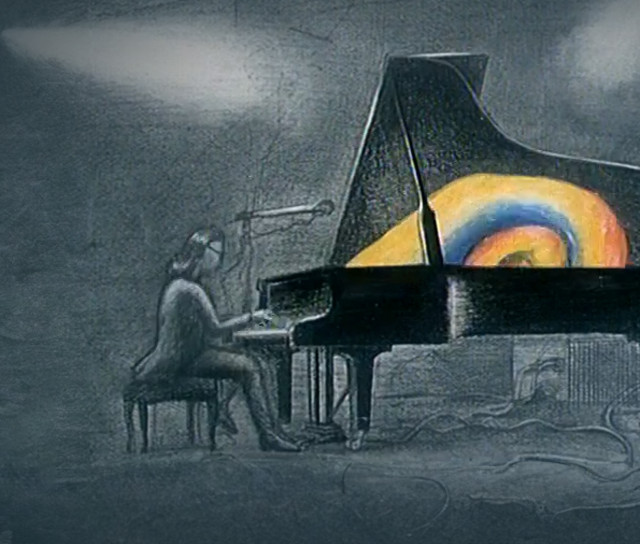 Černobílý svět každodenní reality a barevný svět hudebníkovy fantazie se propojí při vzniku hudebního díla.