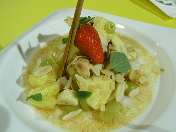 Hroznové víno omyjeme, jablko nakrájíme na plátky, ananas na menší kousky, banán na kolečka a ihned je zakápneme citrónovou šťávou, aby nezčernaly. Mandle nasucho dorůžova opražíme. V misce rozmícháme med, šťávu z pomeranče, citrónu a přidáme špetku skořice. Lehce promícháme s ovocem a posypeme mandlemi. Na závěr můžeme zdobit mátovými lístky. Tip –do zálivky můžeme přidat nízkotučný jogurt.