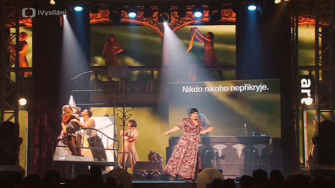 Koncertní provedení je pojato jako kabaret se všemi typickými atributy. Výpravné kostýmy, světelná atmosféra, scéna s množstvím rekvizit. Scénická výpravná režie bratří Cabanů hraje roli stejně důležitou, jako doprovod orchestru a hostů v jazzové sekci. Prostředí pražské Lucerny navodí přesnou atmosféru předválečného kabaretu.