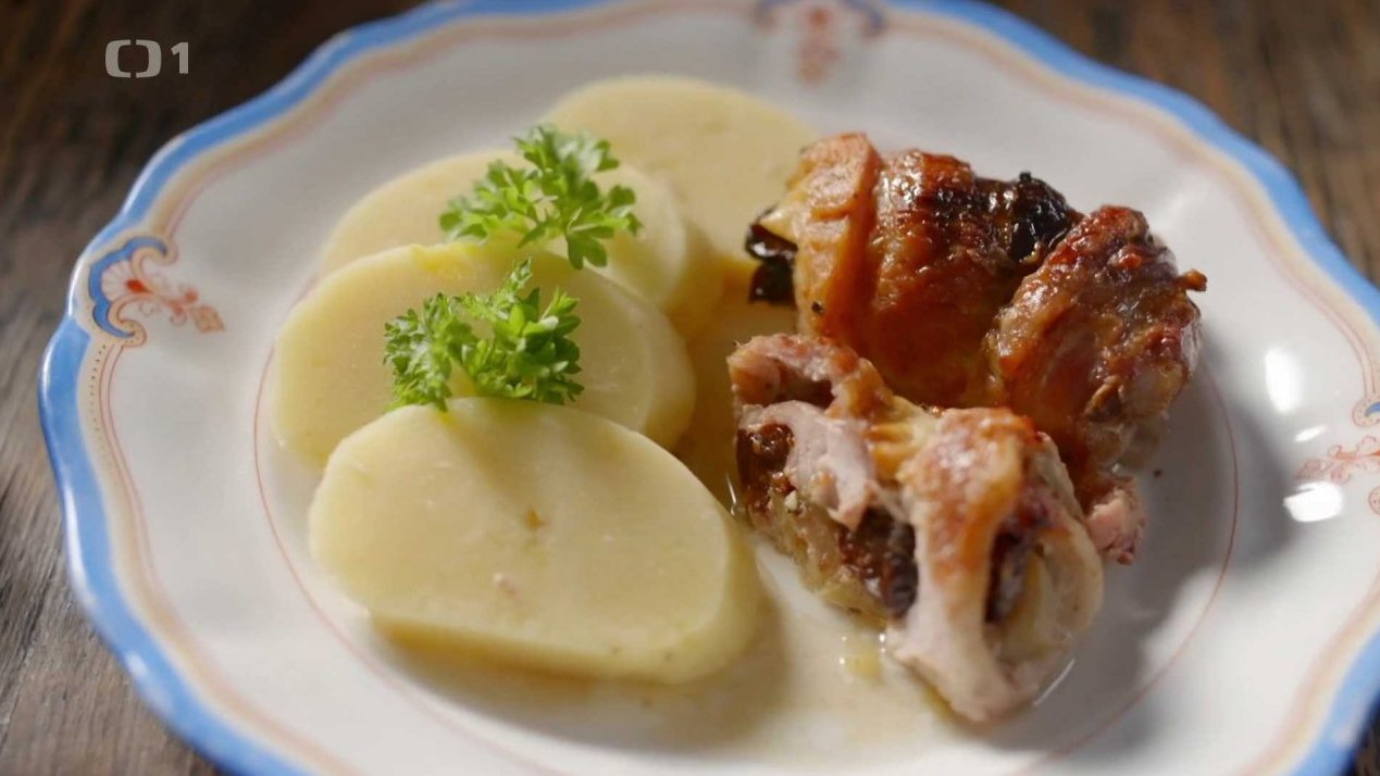 Pokud máme větší kousek vepřového bůčku, rozdělíme ho na dvě části. Poté opatrně odřízneme svrchní tukové krytí. Maso naporcujeme na plátky, které rozklepeme dotenka. Jablka oloupeme, zbavíme jádřinců a nakrájíme na měsíčky. Vepřové osolíme a opepříme z obou stran. Na každý plátek položíme kousky jablek a jednu až dvě sušené vypeckované švestky. Švestky je v tomto případě třeba spařit, aby změkly. Maso pevně zarolujeme a rolky naskládáme do pekáče. Lehce je podlijeme a pečeme na 180 stupňů 30 minut pod poklicí a další půlhodinu odkryté. Maso během pečení neobracíme, pouze podléváme výpekem. Podáváme přelité šťávou, s bramborovým knedlíkem nebo bramborovou kaší.