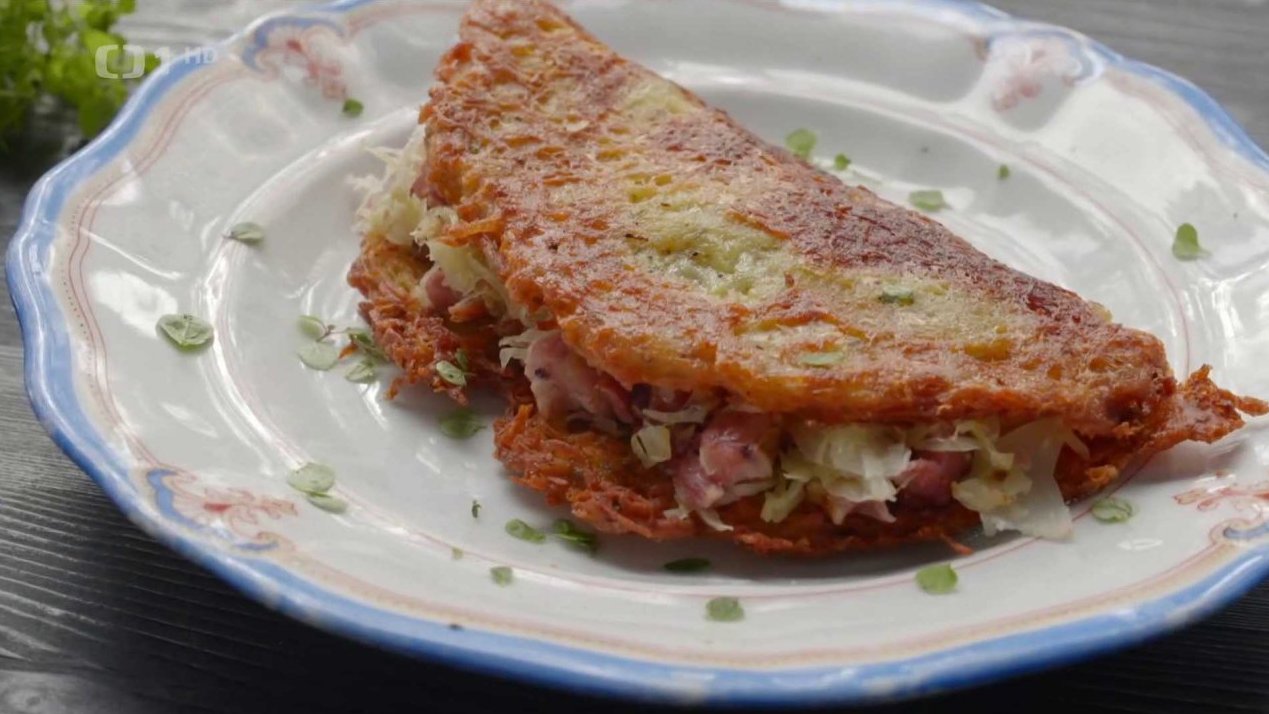 Oloupané brambory nastrouháme na jemném struhadle a poté z nich vymačkáme přebytečnou šťávu. Zalijeme horkým mlékem a promícháme. Oloupeme stroužky česneku, do těsta přidáme vejce, majoránku a mletý kmín, vše osolíme a promícháme. Prolisujeme stroužky česneku, zahustíme hladkou moukou, opepříme a znovu promícháme. Správný bramborák, lidově zvaný také vošouch, báč anebo kramflek, se má smažit na sádle. A hned vedle si rovnou připravíme náplň, dušené kysané zelí s nakrájeným uzeným masem. Na rozehřátém tuku smažíme po obou stranách tenké bramboráky, ze kterých pomocí papírové utěrky odsajeme přebytečný tuk. Na každý bramborák navršíme kysané zelí s uzeným, přeložíme a podáváme.