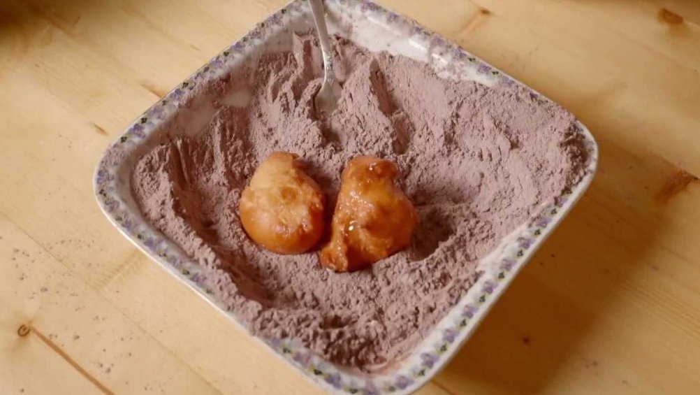 Do mísy prosijeme polohrubou mouku. Přidáme moučkový cukr a také špetku soli. Vše promícháme a ve směsi uděláme důlek, do kterého rozdrobíme droždí. Přilijeme trochu vlažného mléka a promícháme. Rozklepneme dvě celá vejce, přilijeme zbytek mléka, olej, trochu rumu a vymícháme hladké těsto. Je-li těsto příliš řídké, přisypeme malé množství mouky. Mísu s těstem přikryjeme utěrkou a necháme v teple kynout, dokud těsto nezíská dvojnásobný objem. Poté v kastrolu rozpustíme pořádný kus sádla. Kakao smícháme s cukrem, abychom měli připravenou směs na obalování. Kousky vykynulého těsta odkrajujeme lžící a smažíme dozlatova. Hotové myšky necháme krátce okapat a poté obalujeme ve směsi cukru a kakaa.