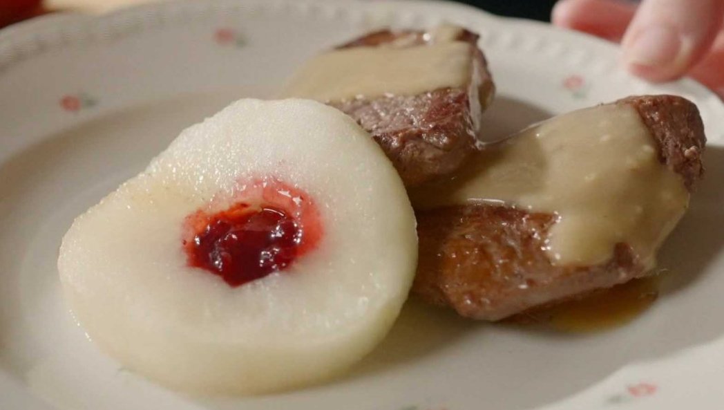 Ve zvěřinových receptech se už od středověku používá ovoce, v našem případě jablka, která oloupeme, nakrájíme a zbavíme jádřince. Jablka podusíme v bílém víně s trochou cukru. Odleželé biftečky zprudka opečeme z obou stran, vyjmeme z pánve a necháme odpočinout. Ve výpeku rozpustíme moučné máslo a přilijeme smetanu. Promícháme a podlijeme trochou vína, ve kterém jsme podusili jablka. Omáčku ochutíme citronovou šťávou a ještě mírně povaříme. Na talíře pak servírujeme srnči biftečky, plátky jablek s brusinkovou marmeládou a naši smetanovou omáčku.