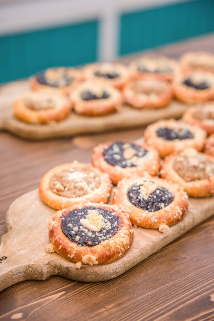 Troubu předehřejeme na 190 °C a vložíme do ní malou misku s vodou. Plechy vyložíme pečicím papírem. Těsto rozdělíme na 21 kousků po 50 g, vytvarujeme kuličky a necháme 10 minut kynout. Poté je skleničkou s rovným dnem (cca 5 cm) rozmáčkneme na koláčky a vytvarujeme okraje. Skleničku občas namáčíme do mouky, aby se nelepila.