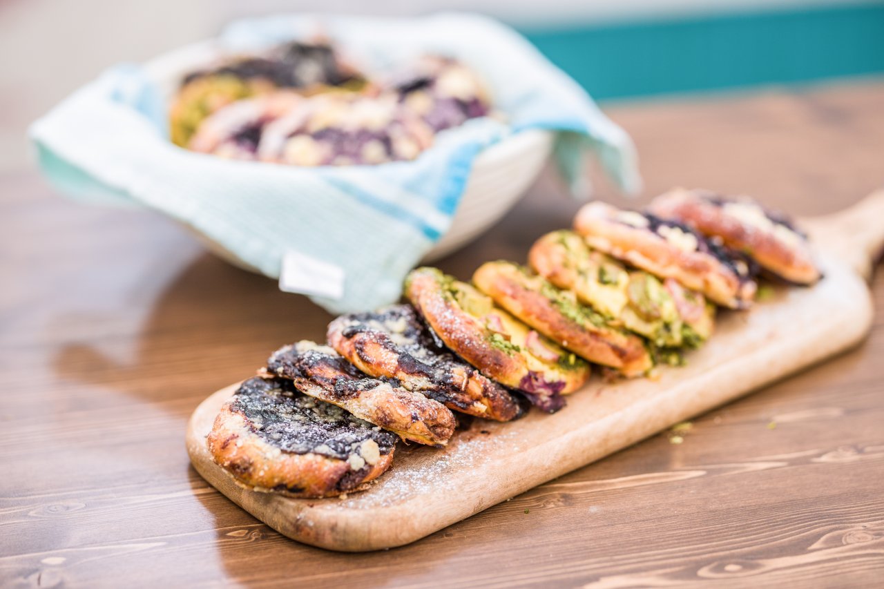 V předehřáté troubě na 180 °C pečeme zhruba 25 minut. Po vytažení potřeme koláčky rozpuštěným máslem smíchaným s rumem v poměru 1:1 a posypeme pistáciemi.