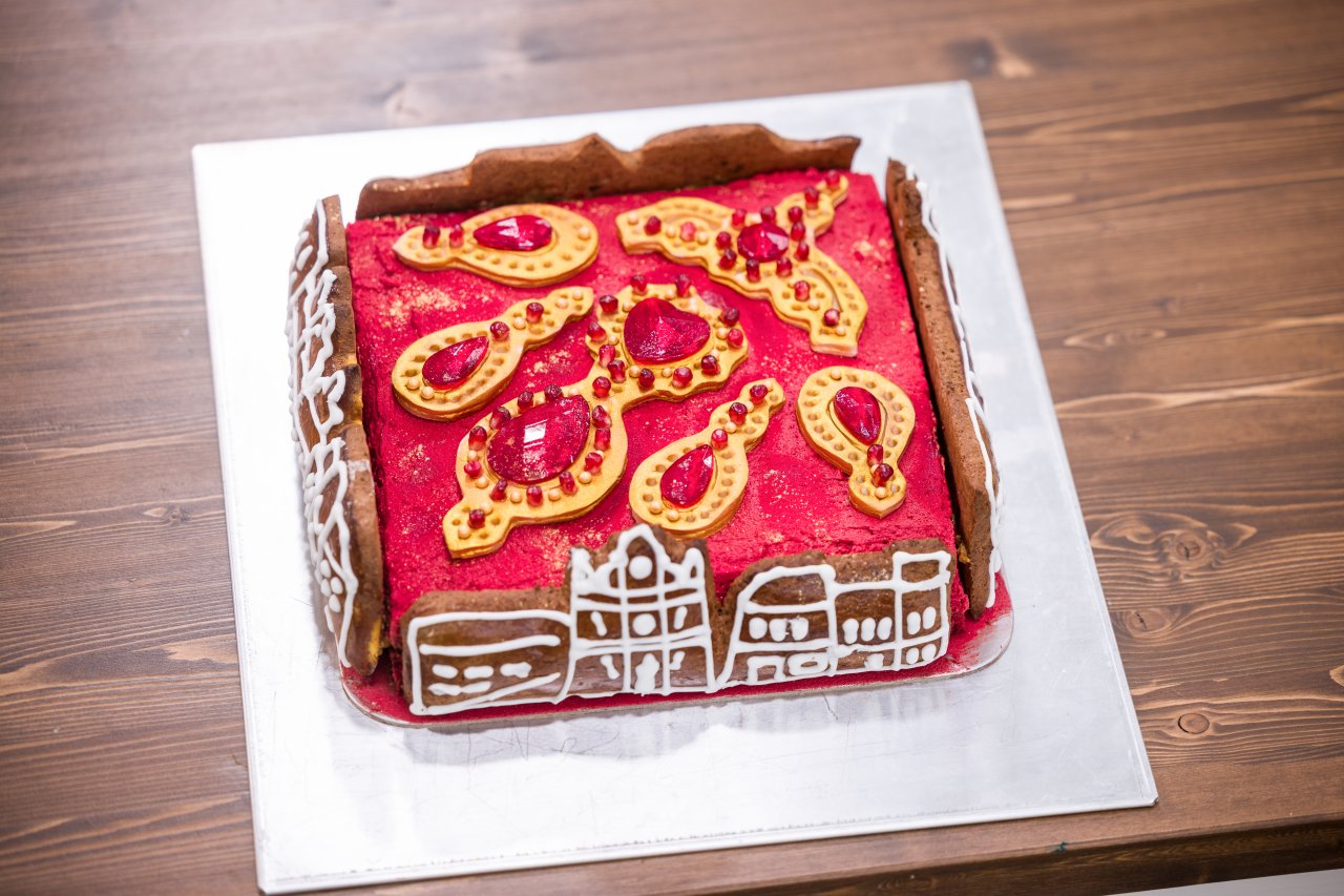 Vychladlý korpus dvakrát prokrojíme a ve čtvercovém ráfku plníme. Plát těsta potřeme marmeládou, naneseme krém a vtlačíme želé vklad. Opakujeme se druhým plátem a přikryjeme posledním plátem, který pomažeme krémem. Dort dáme chladit. Upečené perníčky ozdobíme bílkovou polevou a karamelovým krémem přilepíme kolem obvodu dortu. Vrchní plochu dekorujeme přes šablonu krémem a zlatým sprejem. Doplňujeme isomaltové dekorace a zrníčka granátového jablka.