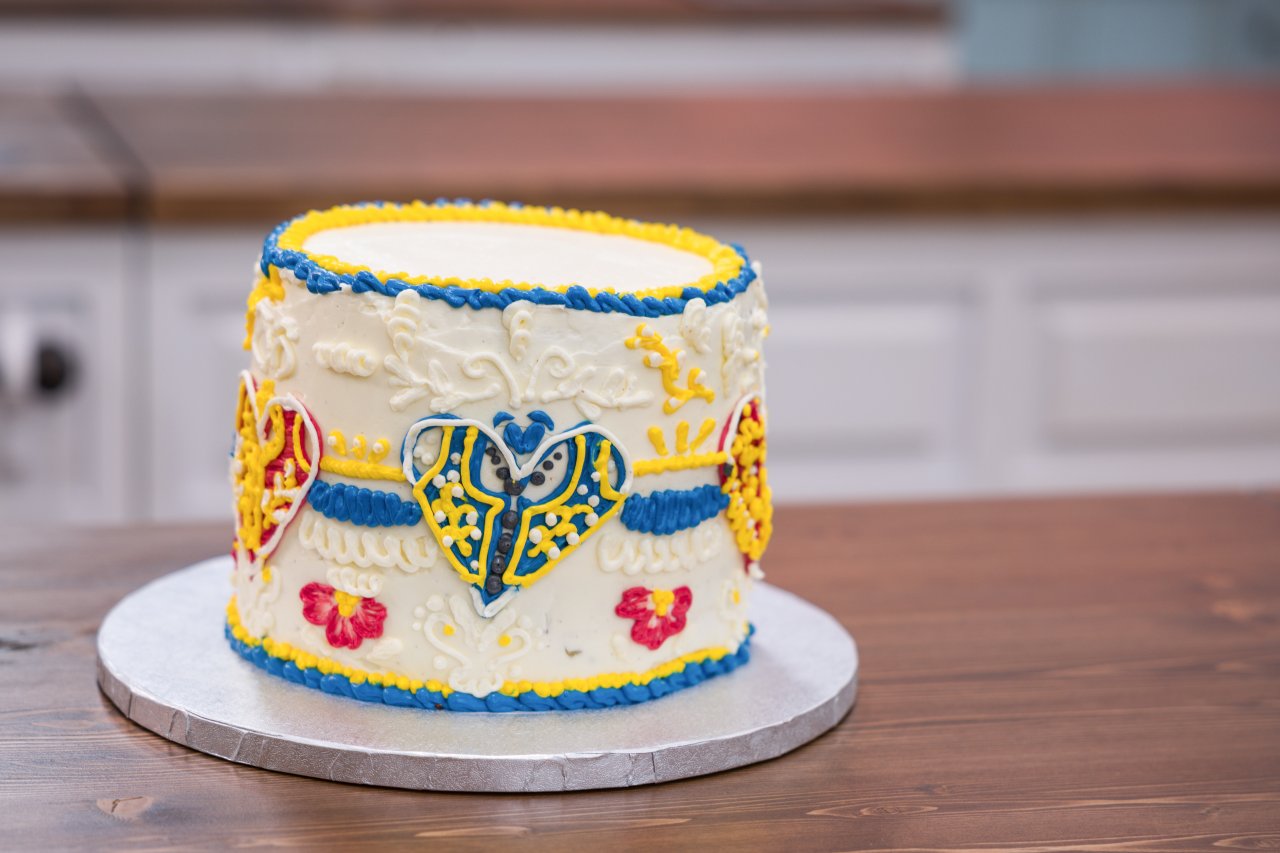 Korpusy rozkrájíme na pláty a prokládáme krémem s medem, hruškovým vkladem a karamelizovanými ořechy. Obmažeme bílkovým krém a zdobíme folklorními motivy z obarveného bílkového krému.
