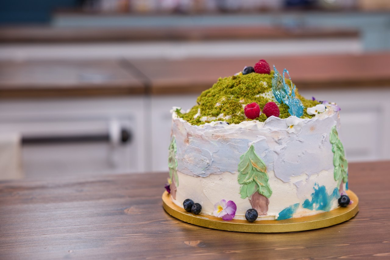 Zbytek krému rozdělíme do 7 částí a obarvíme gelovými barvami. Pomocí zdobících sáčků a špiček vytvoříme folklorní motivy, na boční strany dortu modelujeme les a hory podle Krkonoš. Detaily doladíme prachovými barvami.