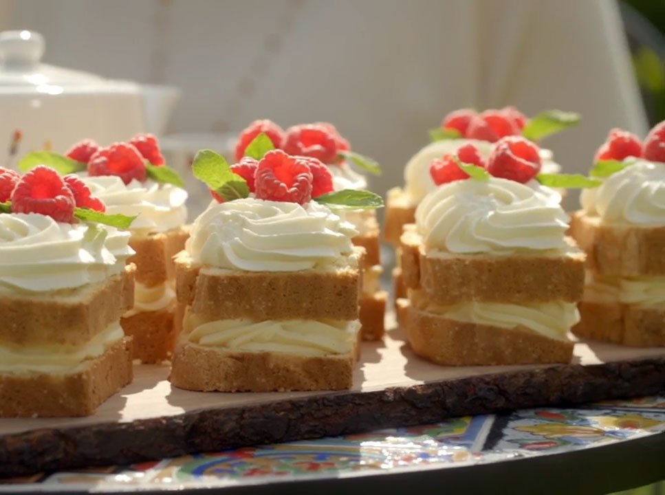 Vychladlý chlebíček rozkrájíme na 15 mm tenké plátky. Vychlazený žloutkový krém vyšleháme do hladké konzistence a stěrkou do něj opatrně vmícháme 100 g ušlehané smetany. Pomocí sáčku s řezanou špičkou Wilton 1M nastříkáme krém na polovinu piškotových plátků. Do krému vmáčkneme 3–4 kousky ovoce (dle velikosti), přiklopíme zbývajícími plátky korpusu a lehce přimáčkneme.