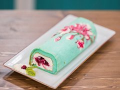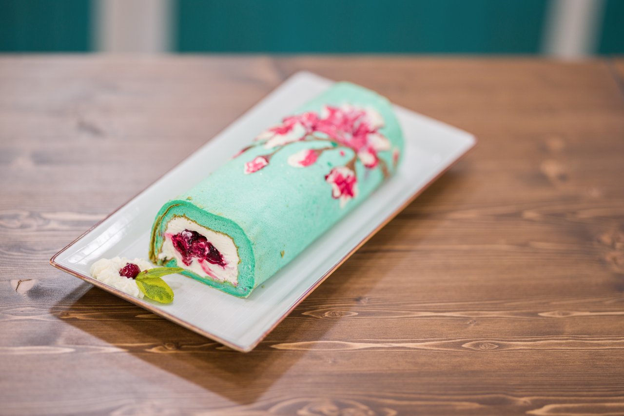 Vychladlou roládu nejprve potřeme třešňovou marmeládou, poté rovnoměrně naneseme třešňový krém a do středu rozložíme nakládané třešně. Roládu opatrně stočíme. Povrch dozdobíme zbylým krémem pomocí zdobicí špičky, doplníme nakládanými třešněmi, čerstvými třešněmi a kaviárem z růžové vody.