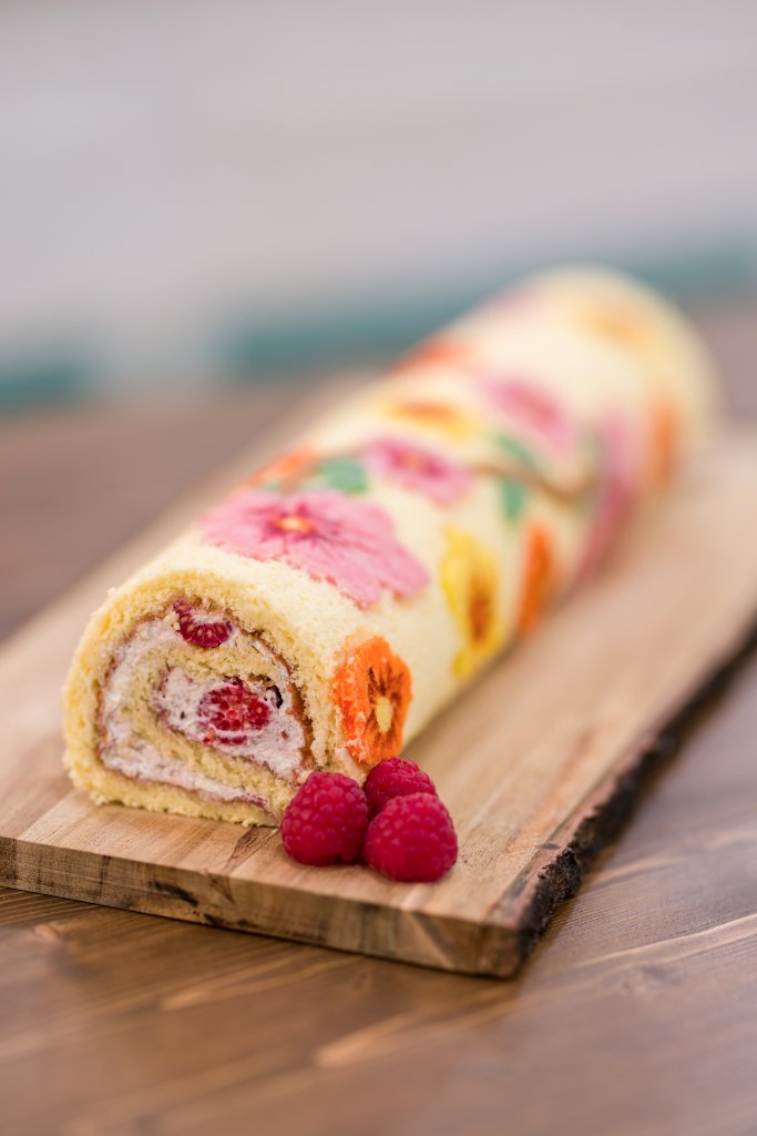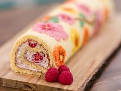 Vychladlý plát otočíme květy dolů, potřeme džemem z černého rybízu a rovnoměrně rozetřeme šlehačku. Do první třetiny plátu doprostřed vyskládáme pruh malin vedle sebe. Pomocí pečicího papíru roládu opatrně smotáme.