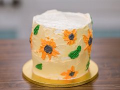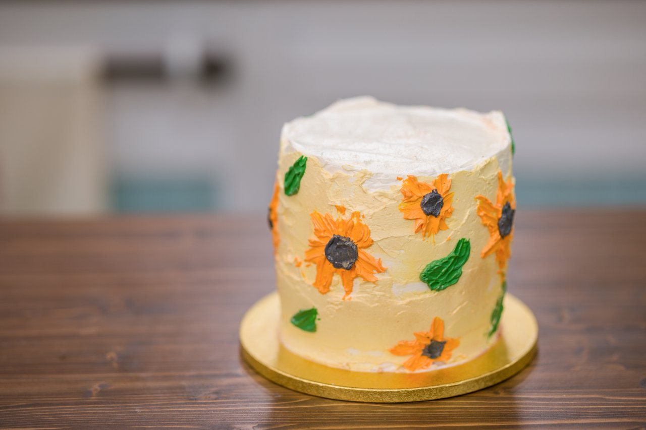 Po navrstvení všech plátů celý dort obmažeme ⅔ sněhovým máslovým krémem. Necháme v lednici chvíli ztuhnout. Poté nanášíme pomocí špachtlí barvy tak, aby na dortu vznikl pás slunečnic s několika lístky. Nakonec nepravidelně dozdobíme několika zlatými vločkami.