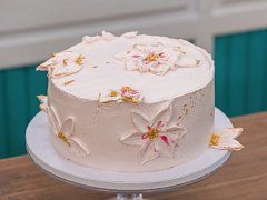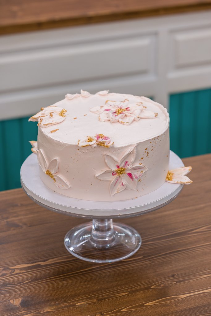 Korpus rozřízneme na tři pláty a každý prokapeme mlékem. Navrstvíme tenkou vrstvu pistáciového krému, rozetřeme křupavou vrstvu. Dále vrstvíme pistáciový krém, malinový crémeux a malinové compoté. Proces opakujeme. Dort obmažeme připraveným krémem a dekorujeme špachtlovanými květy, plátkem zlata a perličkami.