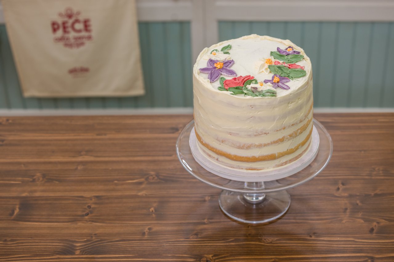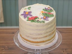 Horní část dortu ozdobíme špachtlovanými květy, případně doplníme drobnými kvítky a lístky na bocích dle časových možností.