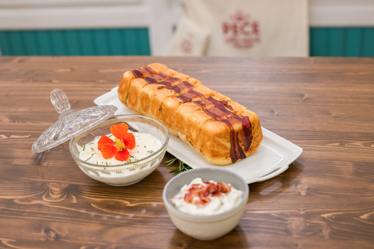 Po nakynutí rozdělíme těsto na 12 dílů po 50 g, každý díl rozválíme a naplníme lžící krému (30 g) a opatrně zabalíme do těsta. To poté vytvarujeme do placky, kterou z poloviny zabalíme do plátku slaniny. Vkládáme do sádlem vymazané formy na srnčí hřbet, každý plátek ještě lehce potřeme rozehřátým sádlem. Takto připravený chléb přikryjeme potravinářskou folií a necháme vykynout. Pečeme 40 minut na 180 °C.