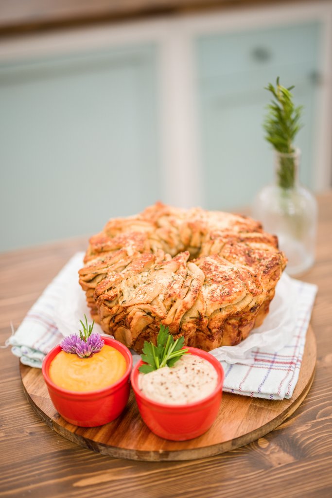 Upečený chléb položíme na dřevěný podnos a podáváme se škvarkovou pomazánkou a čedarovou omáčkou v servírovacích miskách.