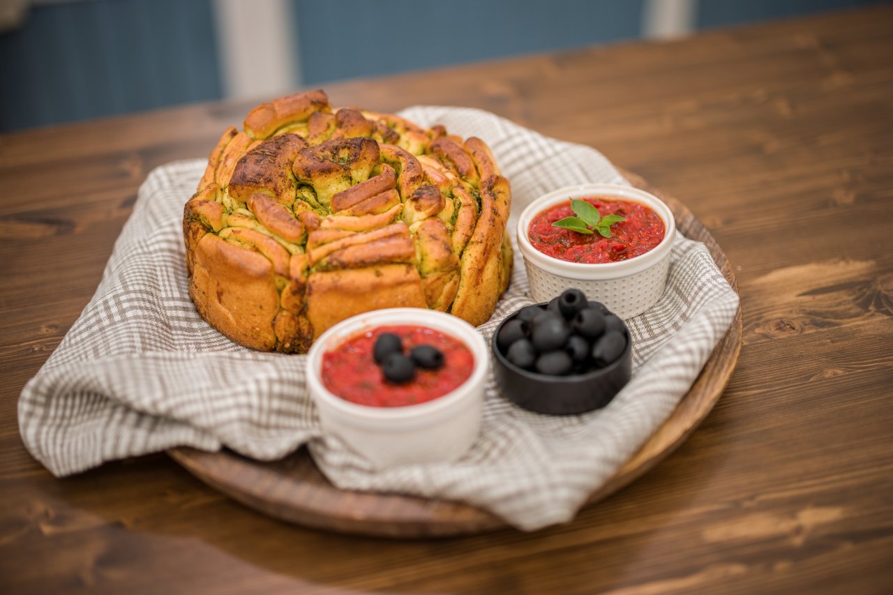 Z droždí, krupicového cukru a 40 g mléka pokojové teploty připravíme omládek. V míse smícháme zbylé suroviny kromě oleje a soli a hněteme do kompaktního těsta. Poté přidáme sůl a olivový olej a hněteme dalších 10–12 minut. Těsto utáhneme, zakryjeme a necháme kynout do dvojnásobného objemu. Vykynuté těsto vyválíme do čtverce o tloušťce cca 0,5 cm, potřeme bazalkovým máslem, posypeme parmazánem a rozkrájíme na obdélníky cca 4 × 8 cm. Tyto dílky skládáme po cca 7 kusech na sebe a vkládáme od kraje ke středu do dortové formy o průměru 23 cm. Necháme kynout dalších 20 minut. Pečeme na horní a dolní ohřev při 180 °C přibližně 30 minut.