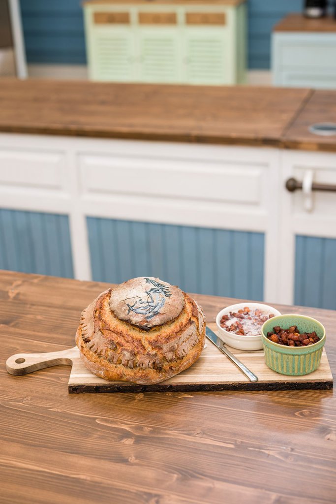 Po 30 minutách zapneme troubu na 250 °C horní a dolní pečení a vložíme do ní litinový hrnec i s poklicí. Za dalších 30 minut je trouba ideálně vyhřátá. Mezitím připravíme těsto na pečení. Vyklopíme ho na pečicí papír a přes šablonu pomocí potravinářské barvy a štětce nakreslíme portrét. Kolem portrétu pomocí skalpelu podřízneme těsto, aby v průběhu pečení nepraskalo přes portrét. V místech vlasů použijeme nůžky a těsto nastříháme. Hotový chleba vložíme pomocí pečicího papíru do rozehřátého litinového hrnce, zaklopíme a dáme péct. Pečeme 20 minut na 250 °C, poté stáhneme teplotu na 220 °C, znovu lehce podřízneme kolem portrétu, již bez poklice, a pečeme dalších 25 minut.