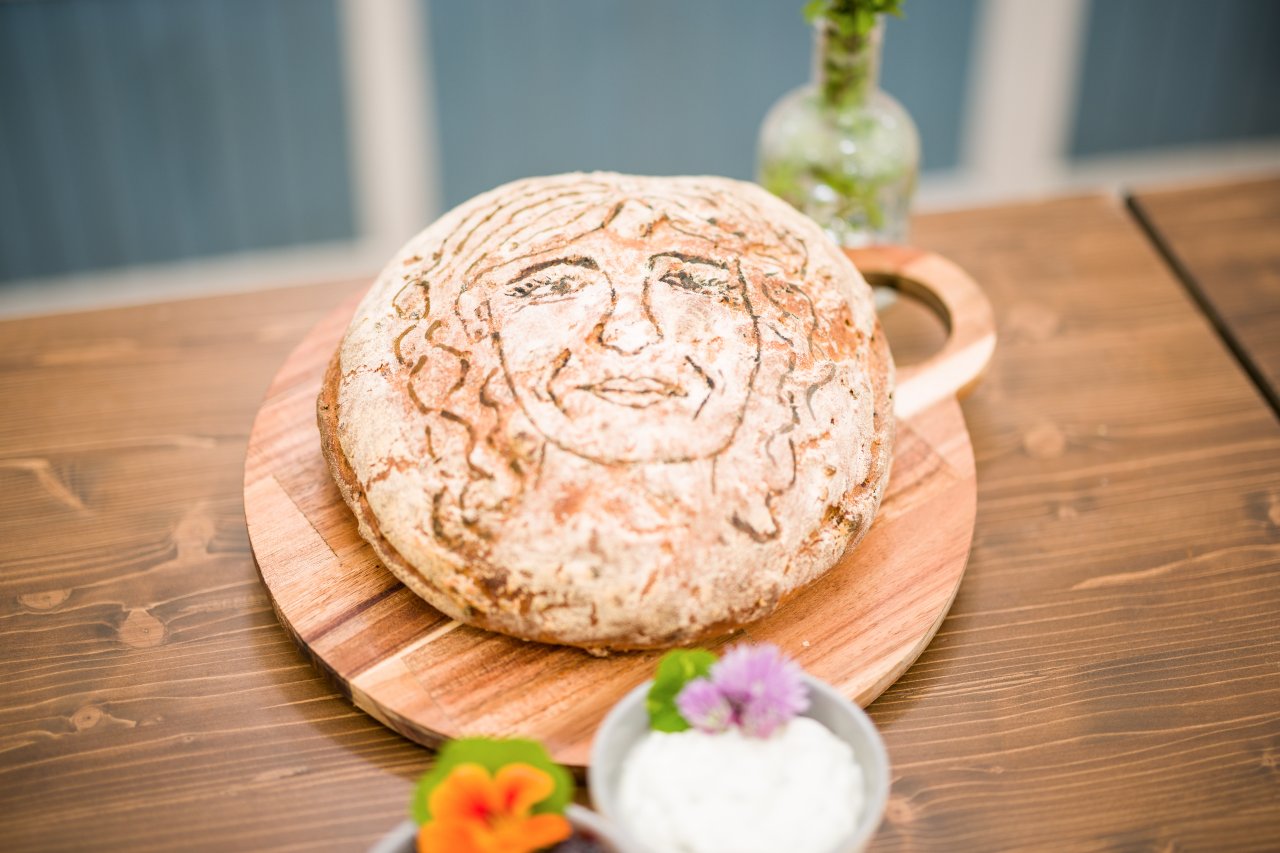 Vykynutý bochník očistíme od zbytků mouky, potřeme vodou a přes sítko rovnoměrně posypeme tenkou souvislou vrstvou hladké mouky. Povrch lehce uhladíme rukou a skalpelem vytvoříme zářezy portrétu, který po upečení jemně dobarvíme gelovými barvami.