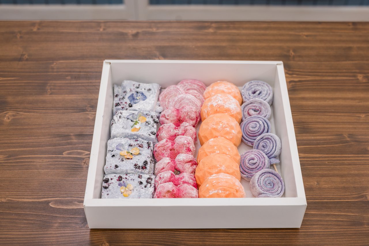 Všechny suroviny si předem odvážíme a připravíme. Želatinu s částí vody necháme nabobtnat. Bílky se 40 g krupicového cukru šleháme do měkkých špiček. Zbylých 40 g vody, 130 g krupicového cukru, glukózu a med zahřejeme na 115 °C, během zahřívání nemícháme. Po dosažení teploty rozvar za stálého šlehání lijeme k bílkům a přidáme nabobtnalou želatinu. Nakonec vmícháme fialkovou esenci, barvivo a lyofilizované borůvky.