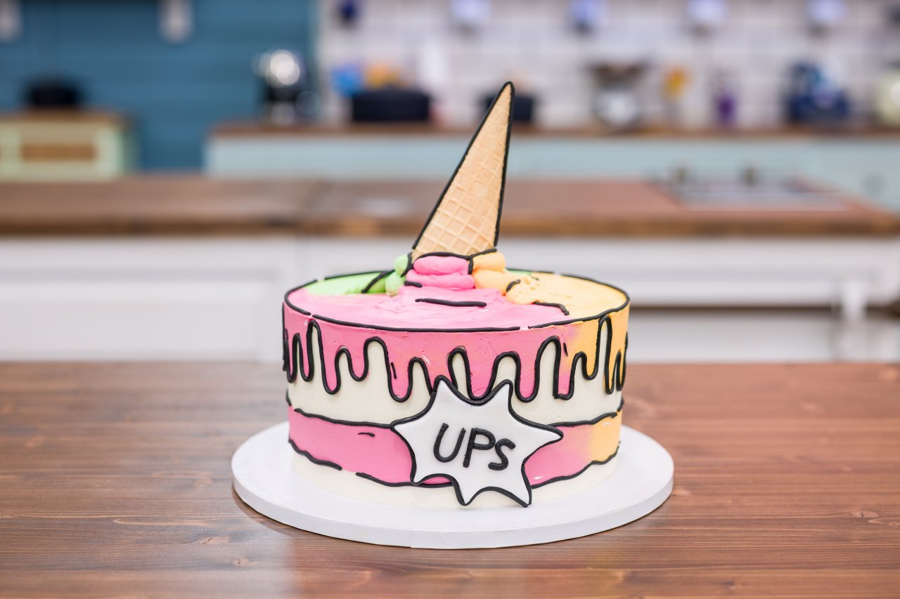 Po vychlazení dort obmažeme neobarveným máslovým krémem a pečlivě zahladíme po obvodu i nahoře. Necháme ztuhnout v lednici. Mezitím pomocí extrudéru z černé hmoty vytvoříme „nudličky“ na zdobení. Na dort naneseme tři barvy krému tak, aby připomínaly roztékající se kopečky zmrzliny, doprostřed zapíchneme kornout. Nakonec vytvoříme černé kontury z marcipánu a bílou barvou dort vystínujeme.