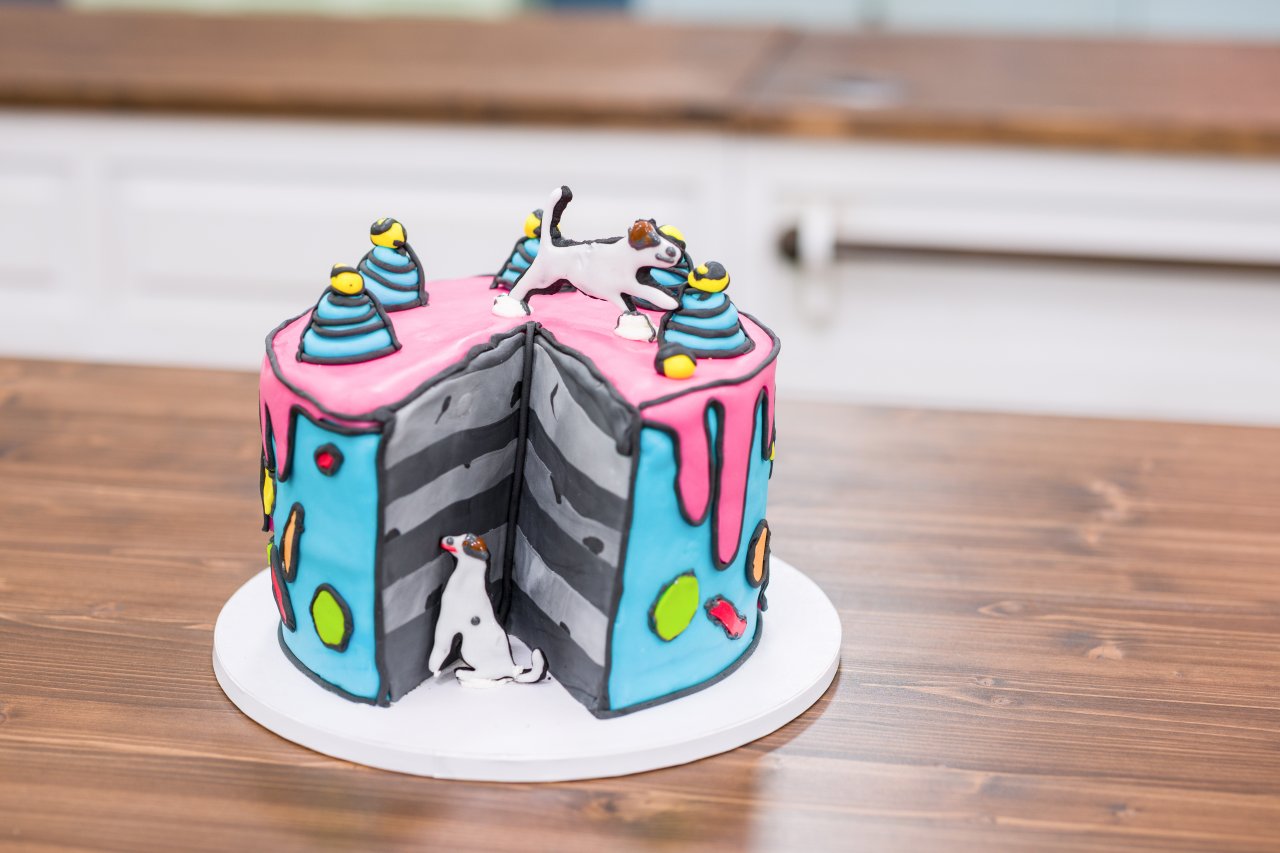 Upečené korpusy prořežeme a každý plát prokapeme. Vrstvíme tak, že na korpus naneseme krém, rozetřeme do tenké vrstvy, posypeme křupavou vrstvou a opět zakryjeme krémem. Z dortu vykrojíme výřez. Dort obmažeme máslovým krémem a necháme vychladit. Sušenky ve tvaru pejsků ozdobíme bílkovou polevou. Fondán obarvíme a potáhneme jím dort. Nakonec do dortu zapíchneme sušenky a dokončíme dekoraci.