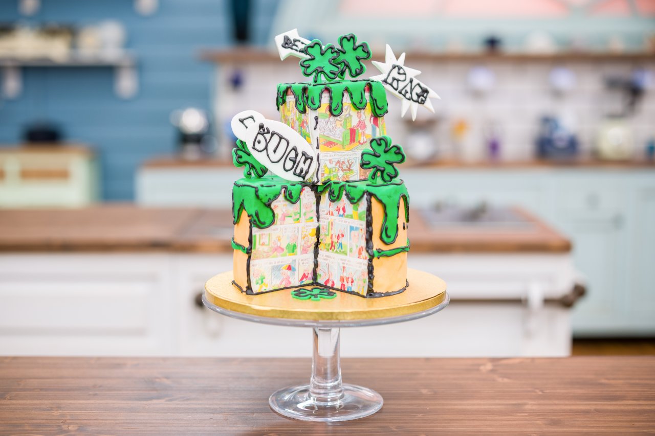 Na vnitřní plochu dortu přilepíme obrázek z jedlého papíru pomocí lepicího gelu. Nakonec zvýrazníme kontury černou bílkovou polevou nanášenou sáčkem s úzkou špičkou.