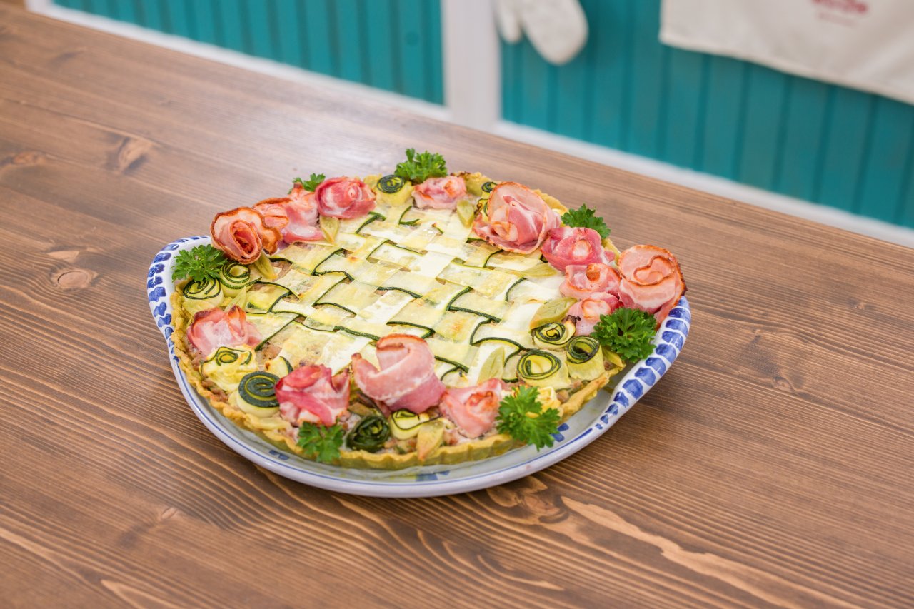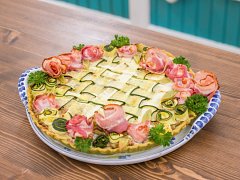 Předpečený korpus naplníme masovou směsí. Proužky cukety střídavě proplétáme a vytváříme vzor proutěného košíku. Z plátků slaniny tvarujeme malé růžičky a klademe je ke krajům koláče. Z předpečených plátků cukety tvoříme rolky, každý plátek stočíme, rozpůlíme a vzniklé rolky použijeme k dozdobení slaninových růžiček.